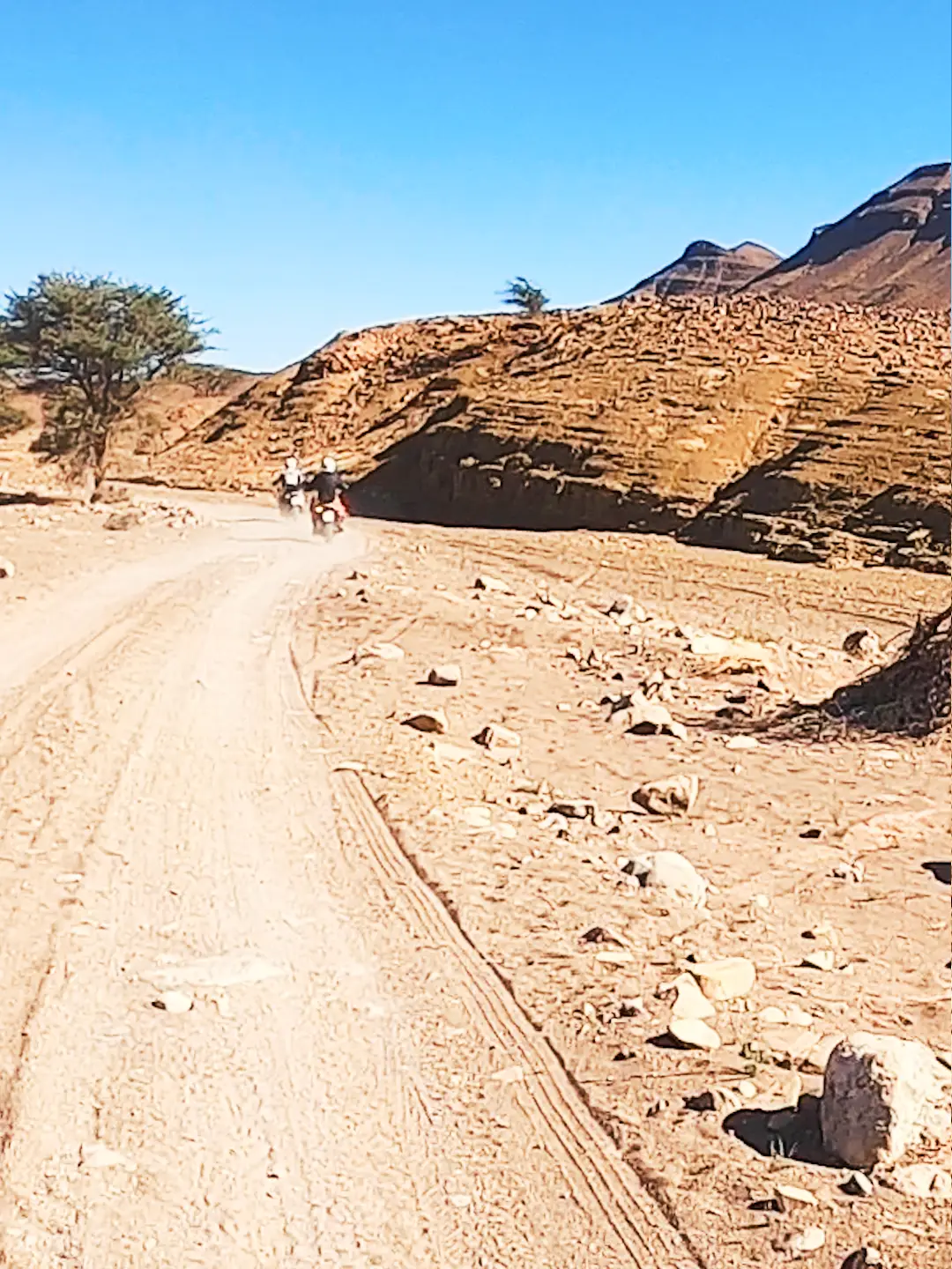 Salimos de Zagora y nos dividimos de nuevo. Tres motos van por pista hasta la hora de comer en Agdz.