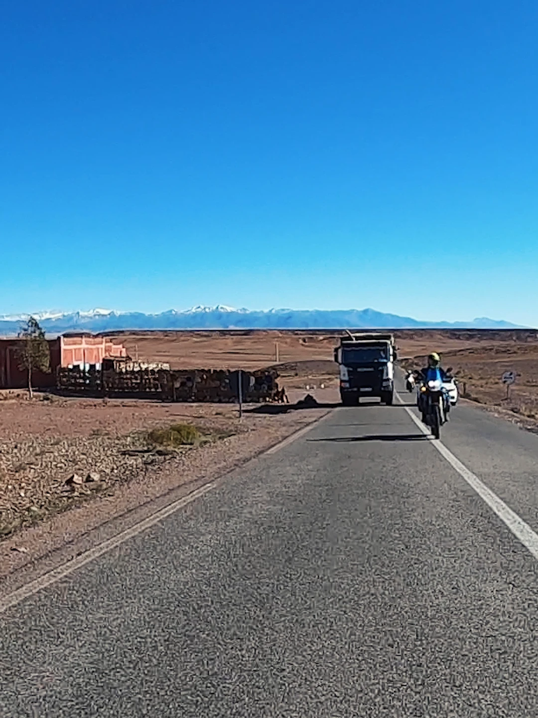 Desde aquí se empieza a subir y la carretera deja el margen del valle hasta llegar a Ouarzazate con impresionantes vistas de las montañas de Atlas nevadas.