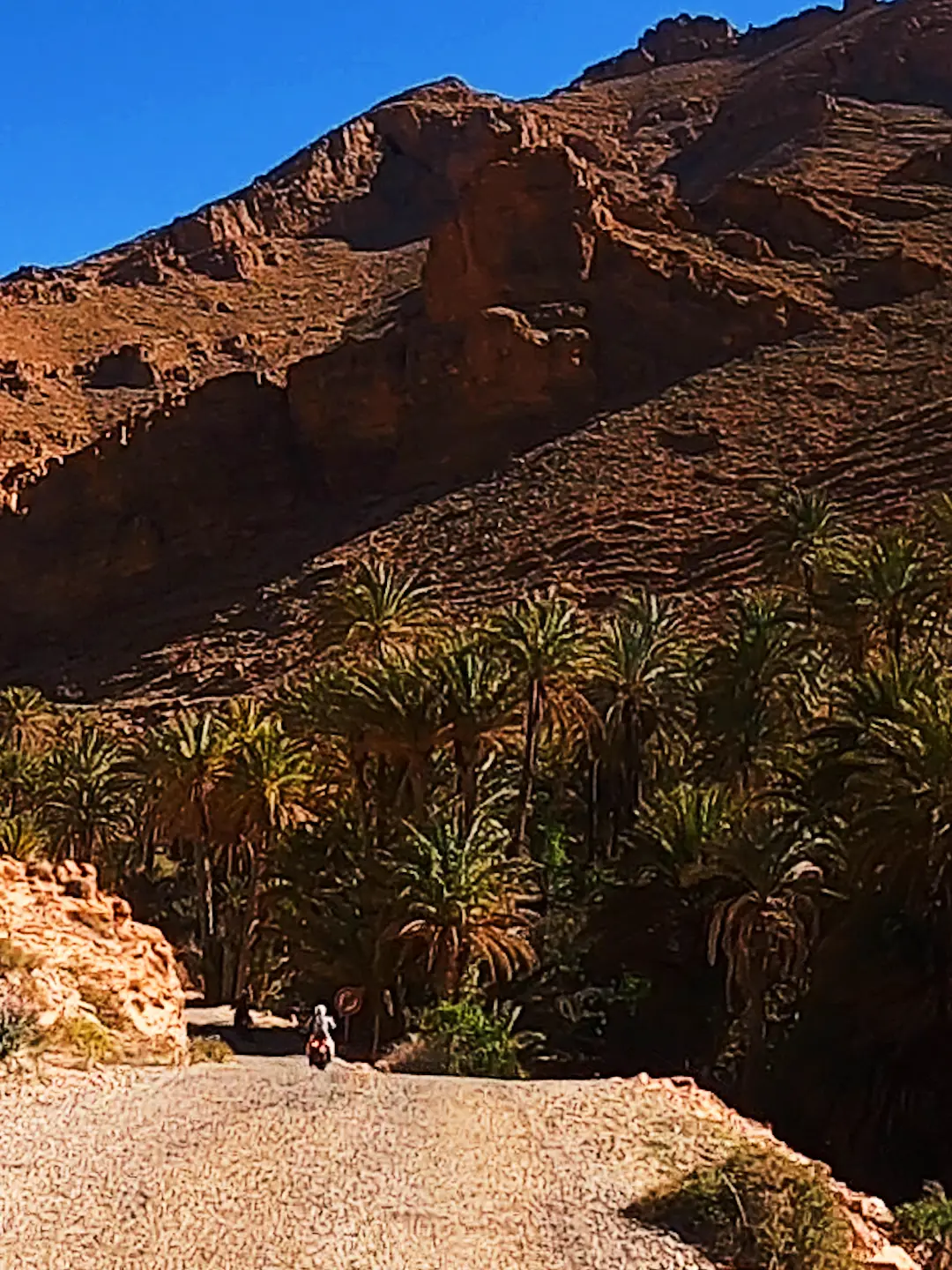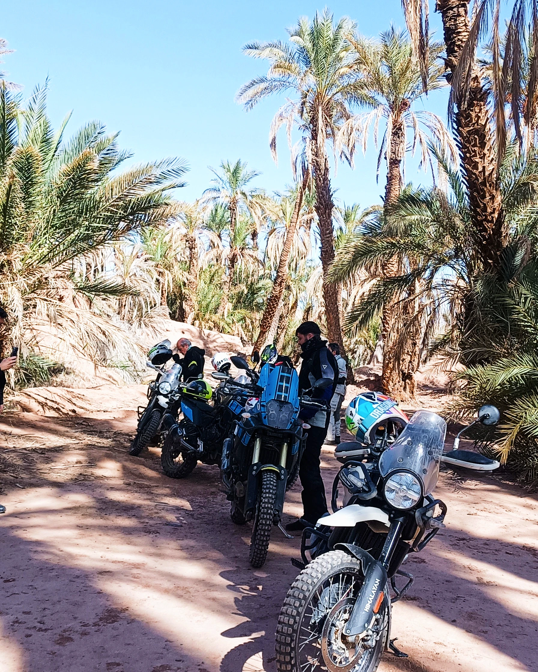 Por carretera disfrutamos de las vistas pero empezamos a tener un tráfico que hasta ahora no teníamos en el viaje. Nada más salir de Zagora bajamos a recorrer el palmeral con las motos.