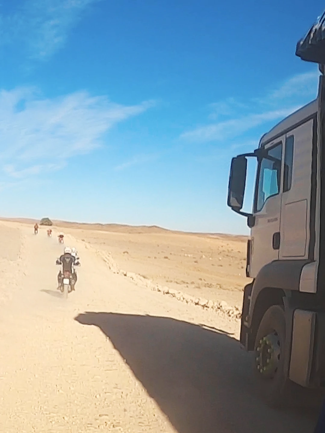 Y eso encontramos, arena, solo en algunos tramos de la pista, pero el grupo pasó compacto sin complicaciones a buen ritmo entre los camiones de las minerías, el único tráfico que tuvimos desde la salida de Agadir.