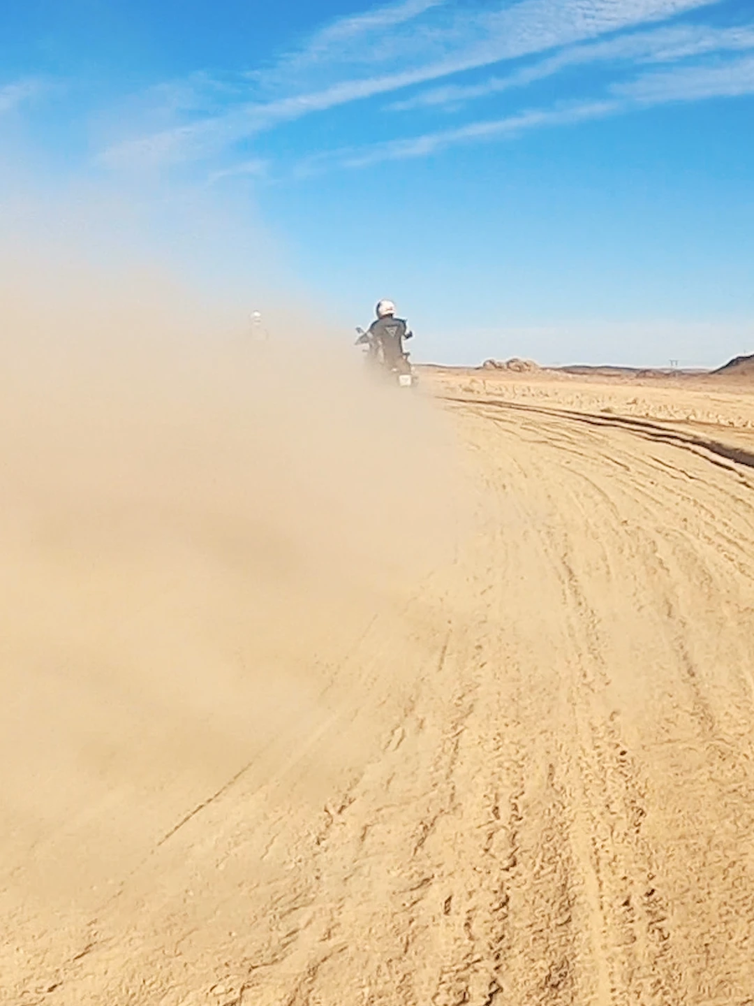 Yo sigo con el grupo de pista y hacemos unos 80 kilómetros, con algunos tramos de carretera. La pista en buen estado, pedregosa algunas veces, sin dificultades técnicas, sólo la acumulación de arena en que incluso en esas planicies hace que pierdas el camino.