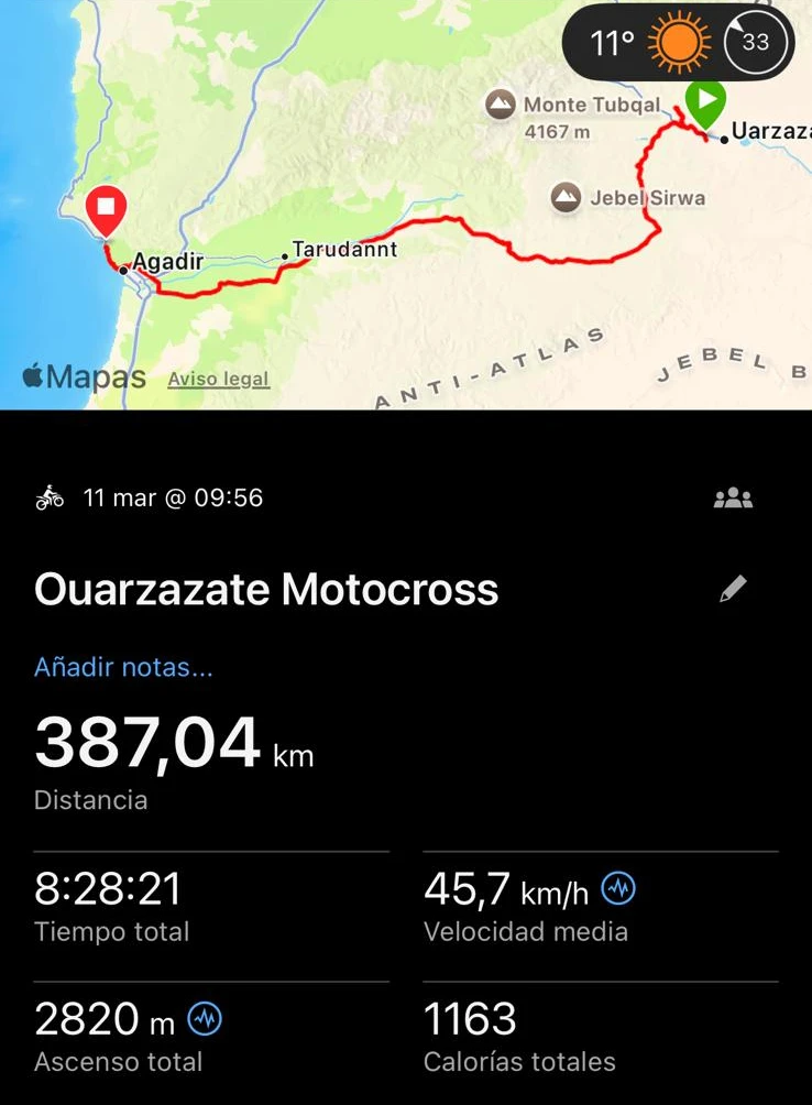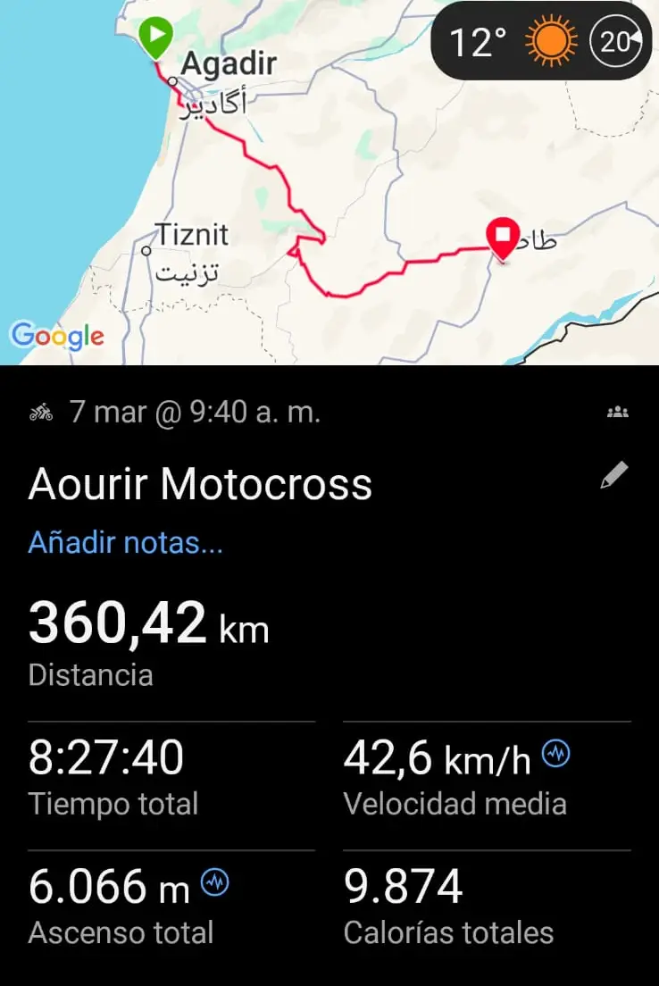 Llegar en un vuelo y salir en un vuelo de Agadir son dos días y el viaje en moto 5. En total una semana.